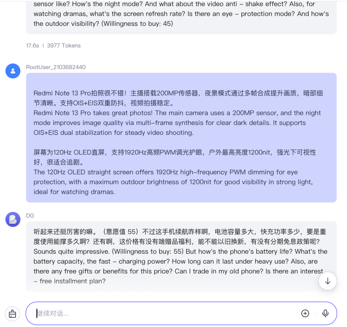 After supplementing detailed explanations to the customer's questions, the customer's purchase willingness score has risen to 55 points.