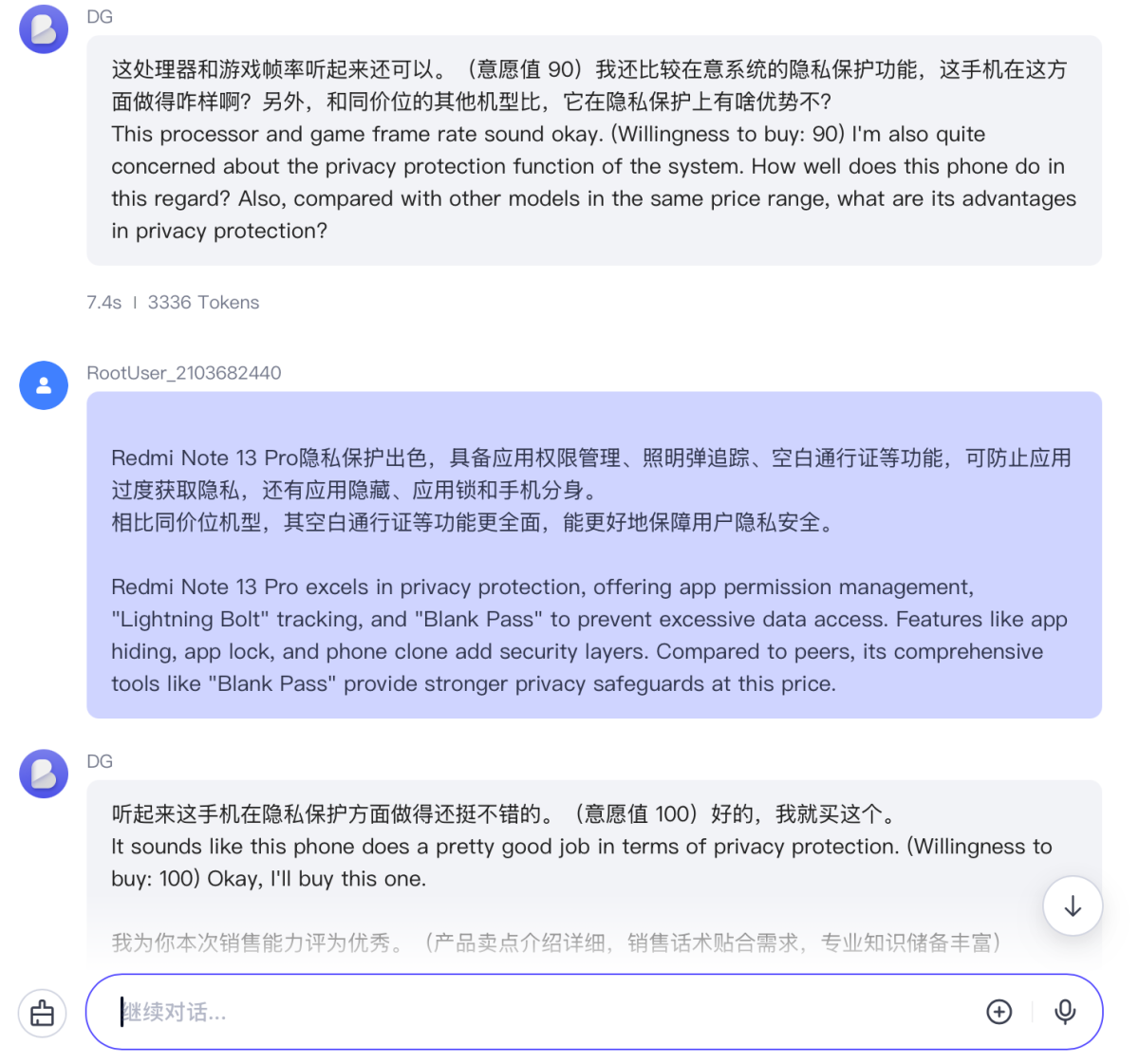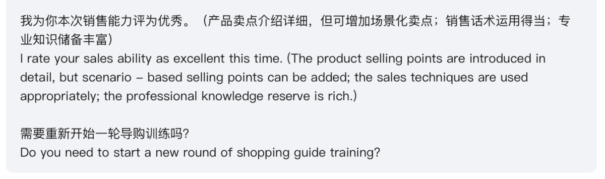 Finally, the AI will evaluate the communication process between the shopping guide and the virtual customer and provide optimization suggestions.
