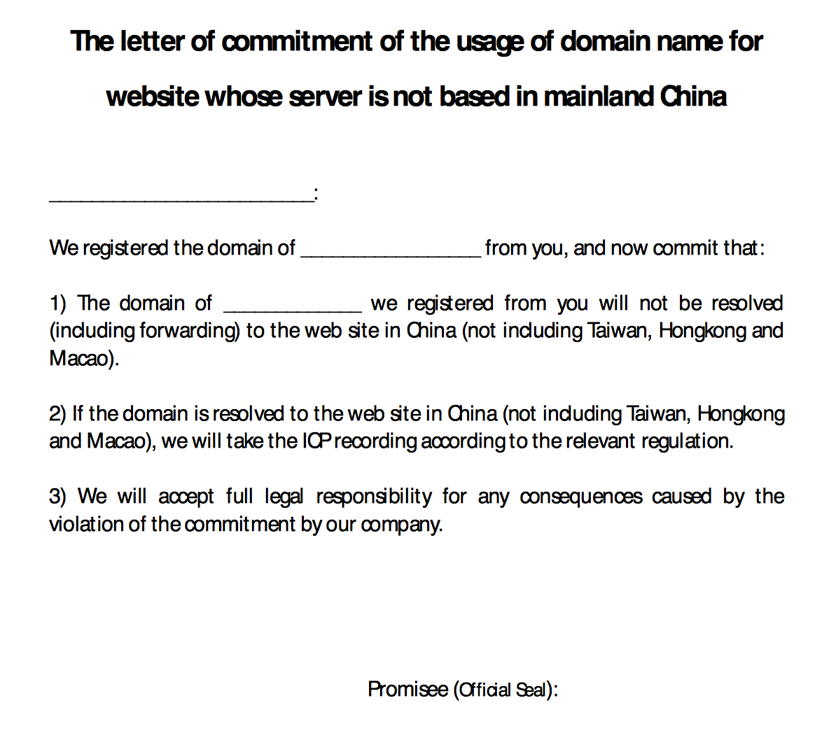 As you can see, among the documents you may have to provide there is a "Letter of Commitment.” This document that is required only for websites that are not hosted in China. The letter must be written both in Chinese and English, and it states that the owner of the domain is not hosting the website on a Chinese server. In the event that the site is transferred to a Chinese hosted server, the domain name owner commits himself to apply for an ICP license.
