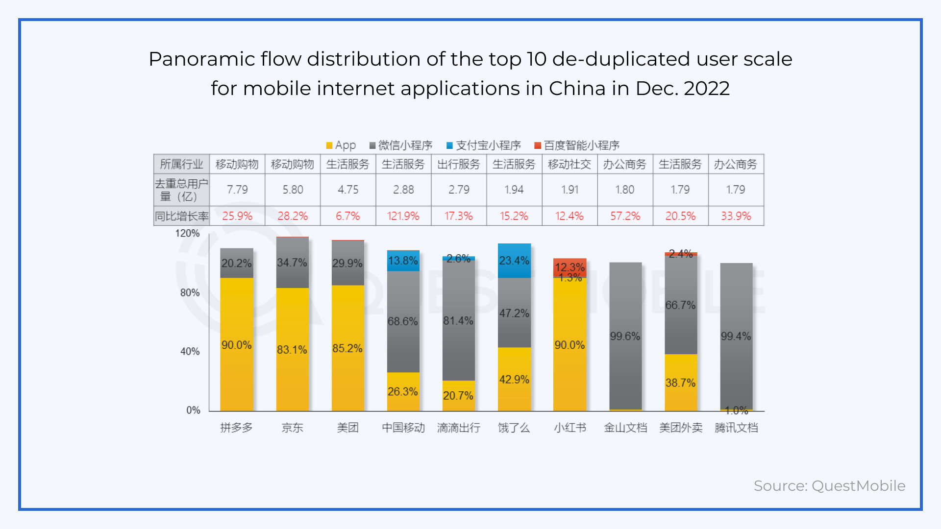 According to QuestMobile’s 2022 year-end report, many WeChat Mini Programs outcompete their native app counterparts. This is true for city services (China Mobile) and food delivery services (Elema and Meituan food delivery) and especially true for online document sharing services (Jinshan Docs and Tencent Docs).