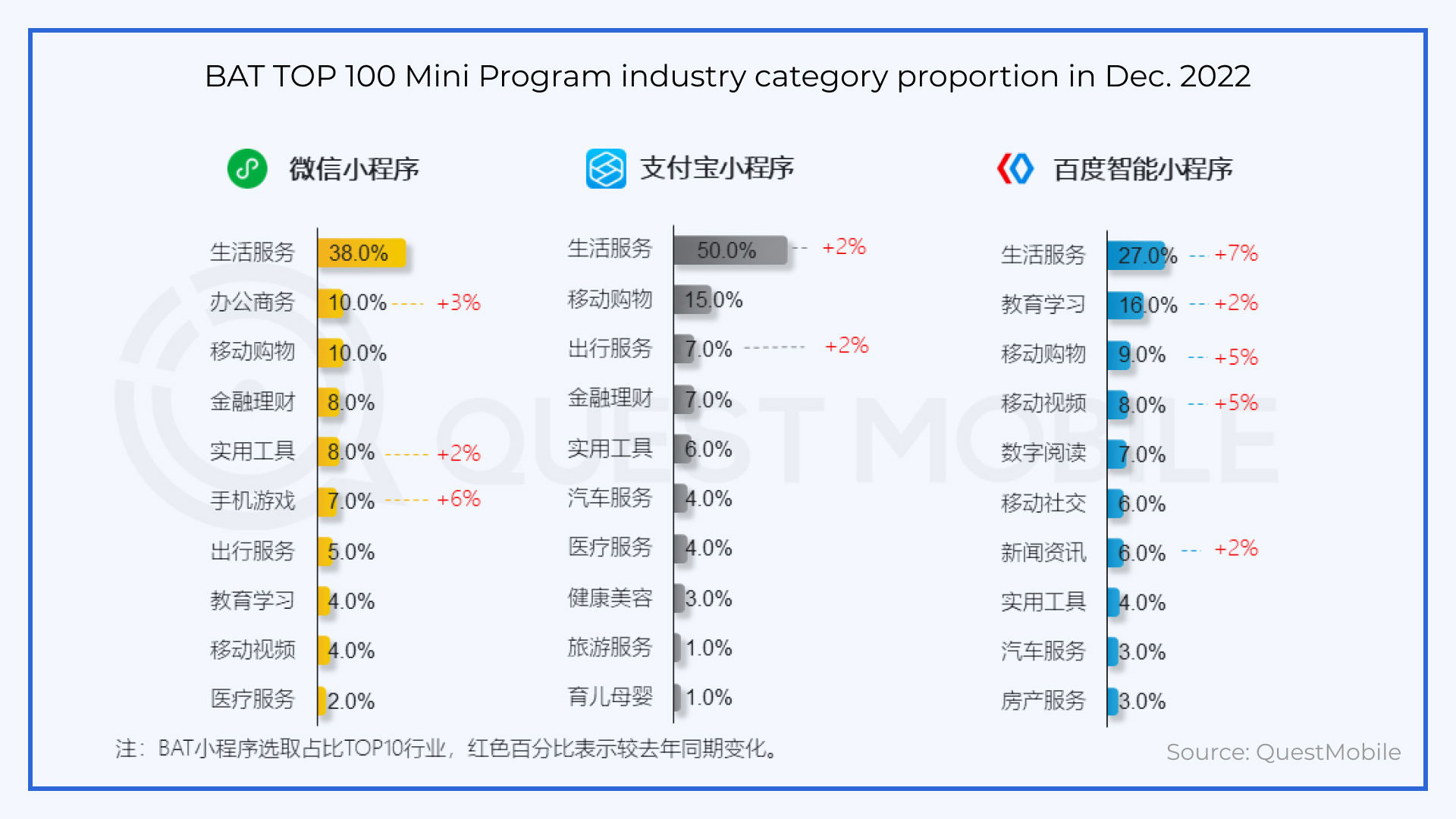 According to QuestMobile’s 2022 year-end report, the main type of Mini Program service across platforms is lifestyle services. Lifestyle Mini Programs constitute the most common service seen on WeChat, Alipay, and Baidu. Ecommerce Mini Programs also rank in the top three across these platforms.
