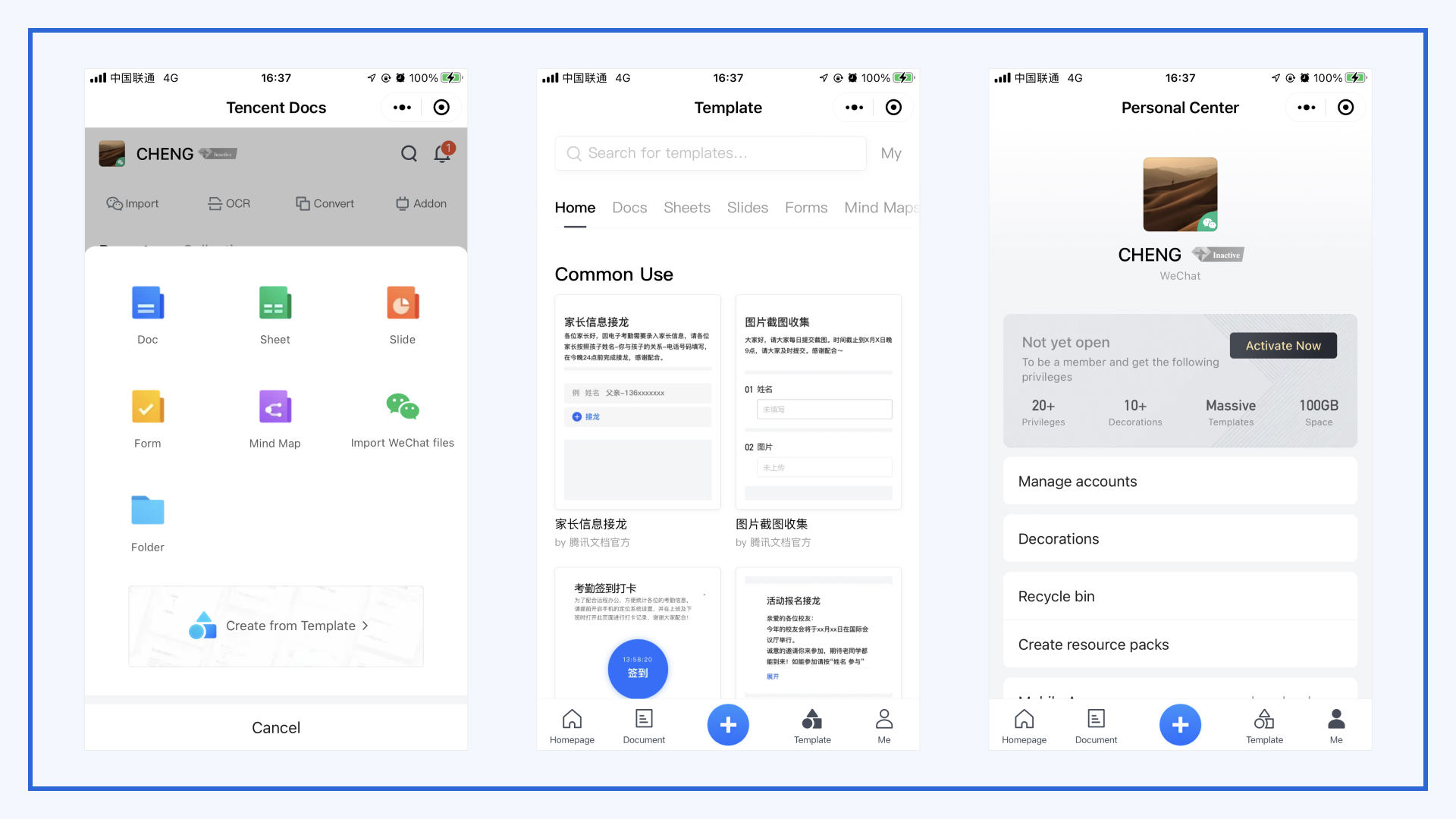 As a native app, Tencent Docs resembles Google Docs in its scope, offering Doc, Sheet, Slide, Form, and Mind Map formats. As a Mini Program, Tencent Docs is fully featured, and includes useful functions such as scan-to-convert functions, PDF conversion, sharing documents to other WeChat users, importing files from WeChat, and various third-party add-ons.